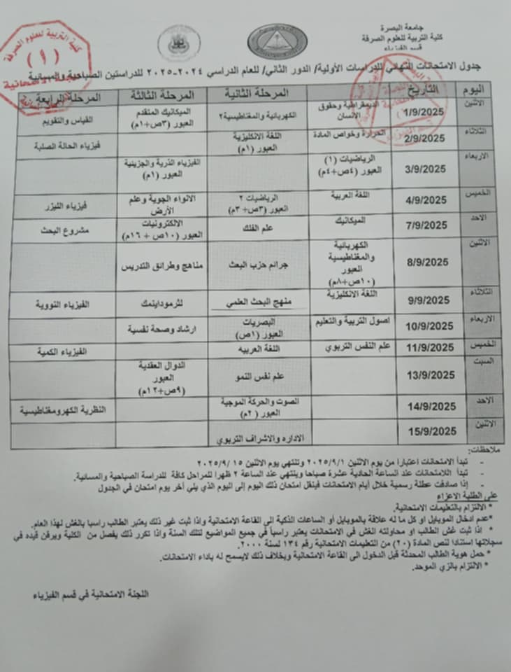 اعلان جدول الامتحانات النهائية للدراسة الاولية للدور الثاني للعام الدراسي 2024-2025
