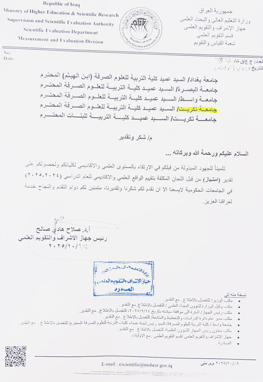 حصلت كلية التربية للعلوم الصرفة في جامعة البصرة على تقدير (امتياز) في تقييم الواقع العلمي والأكاديمي للعام الدراسي 2024–2025 الذي ينظمه جهاز الإشراف والتقويم العلمي - قسم التقويم العلمي - شعبة القياس والتقويم في وزارة التعليم العالي والبحث العلمي.
