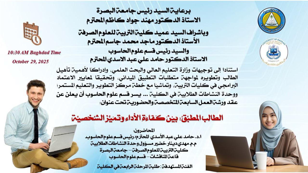 جامعة البصرة تعقد ورشة عمل حول(الطالب المطبق:بين كفاءة الاداء وتميز الشخصية)