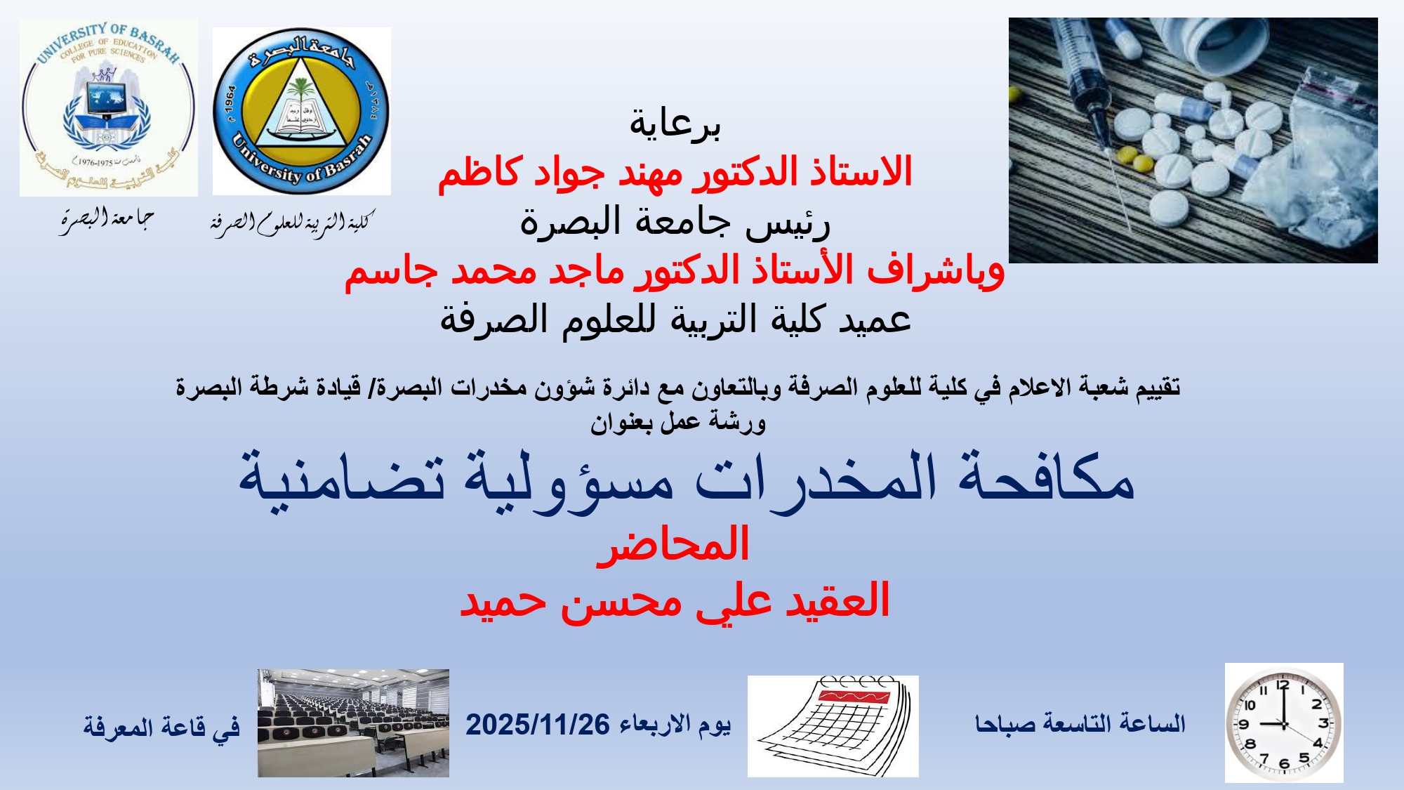 جامعة البصرة تقيم ورشة عمل حول (مكافحة المخدرات مسؤولية تضامنية)