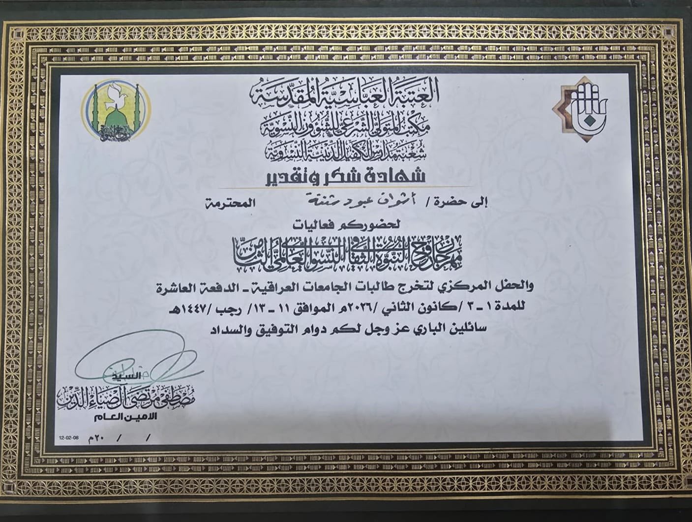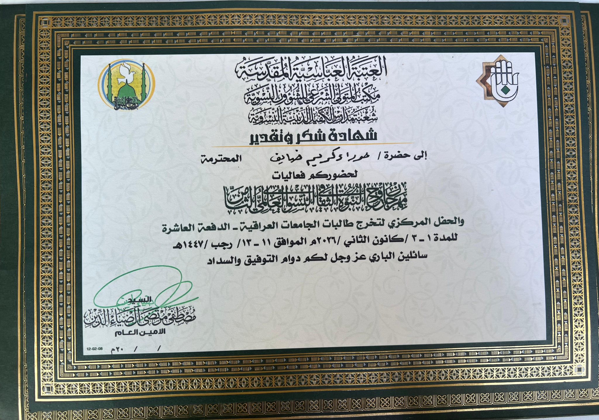 شاركت عدد من التدريسيات في كلية التربية للعلوم الصرفة من قسم الكيمياء كل من أ.م. حوراء كريم ضايف و م.د اشواق عبود شنتة في مهرجان روح النبوة الثقافي النسوي العالمي الثامن الذي ضم نخبة مميزة من الباحثات من داخل العراق وخارجه لمناقشة الابحاث حول سيرة السيدة فاطمة الزهراء( عليها السلام) مجمع النورين النبوة والامامة كما تضمنت الدعوة المشاركة في حفل تخرج بنات الكفيل الذي ضم ٥٠٠٠ طالبة من مختلف الجامعات العراقية.