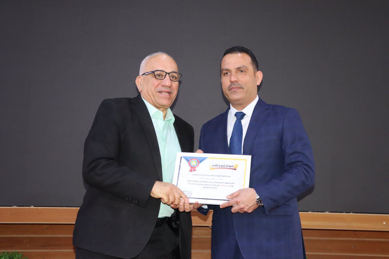 من جانبه، أعرب عميد الكلية عن شكره وتقديره لرئاسة الجامعة على هذا التكريم، مؤكداً أن ما تحقق هو ثمرة جهود جماعية متواصلة، ودافعٌ لمواصلة العمل وتحقيق المزيد من النجاحات التي تخدم المسيرة العلمية للجامعة.