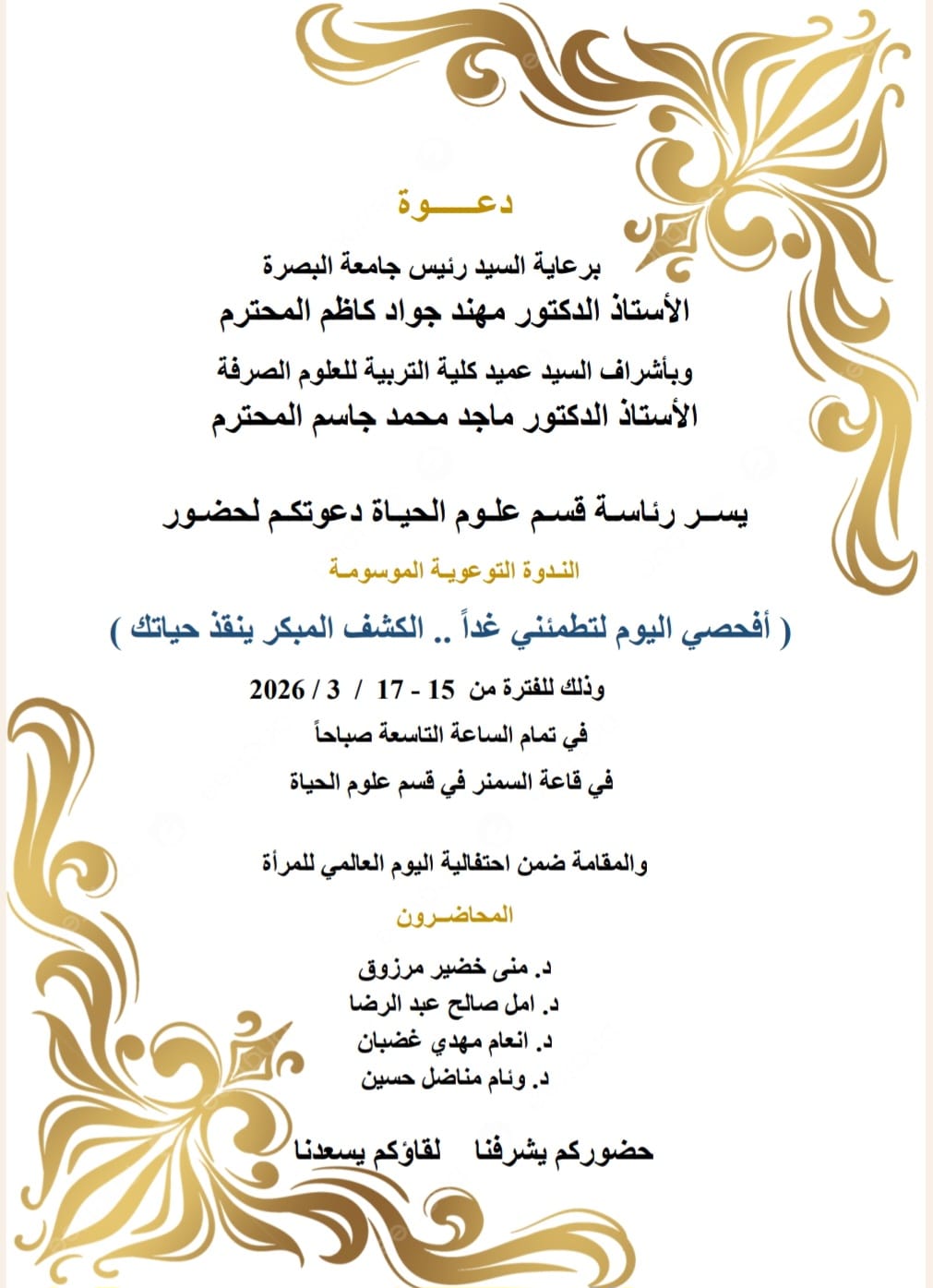 قسم علوم الحياة يقيم ندوة توعوية بعنوان(أفحصي اليوم لتطمئني غداً ...الكشف المبكر ينقذ حياتك)