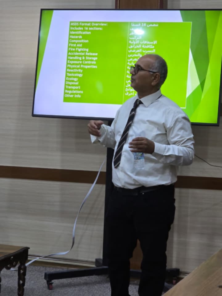 برعاية السيد رئيس الجامعة الأستاذ الدكتور مهند جواد الاسدي المحترم، وبإشراف السيد عميد كلية التربية للعلوم الصرفة الأستاذ الدكتور ماجد محمدجاسم المحترم، وبحضور رئيس لجنة الـ CBRN الأستاذ الدكتور علي جميل، افتُتحت يوم الأحد الموافق 5/10/2025 دورة السلامة الكيمياوية المخصصة لطلبة قسم الكيمياء في مرحلتي الدكتوراه والماجستير. وأُقيمت فعاليات الدورة على قاعة المعرفة في مجمع القاعات حيث قدّم الأستاذ الدكتور حسين حسن حسين محاضرة السلامة الكيمياوية في المختبرات البحثية وقدم الأستاذ مساعد دكتور بسام عاشور رشيد محاضرة Material Safety Data Sheet بينما قدم الأستاذ مساعد دكتور حسنين عبد الصمد عبد المجيد محاضرة في مخاطر المواد الكيمياوية وتاثيرها واختتمت الدورة بالتدريب العملي على اطفاء الحرائق من قبل مدرس مساعد هادي عبد الصمد جابر.